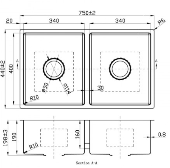 SKU:PR4034ND Bowl : 340 x 400 x 190mm; Overall:750 x 440 x 200mmmm; Thickness: 0.8mm; Square UnderMount Sink; Mounting clips & basket waste inl.