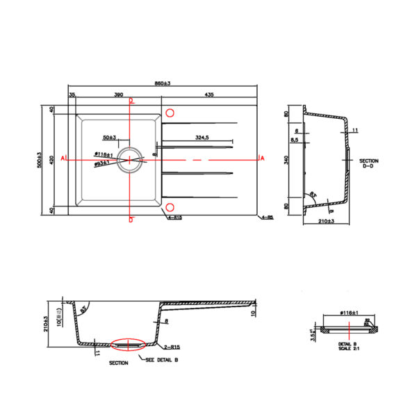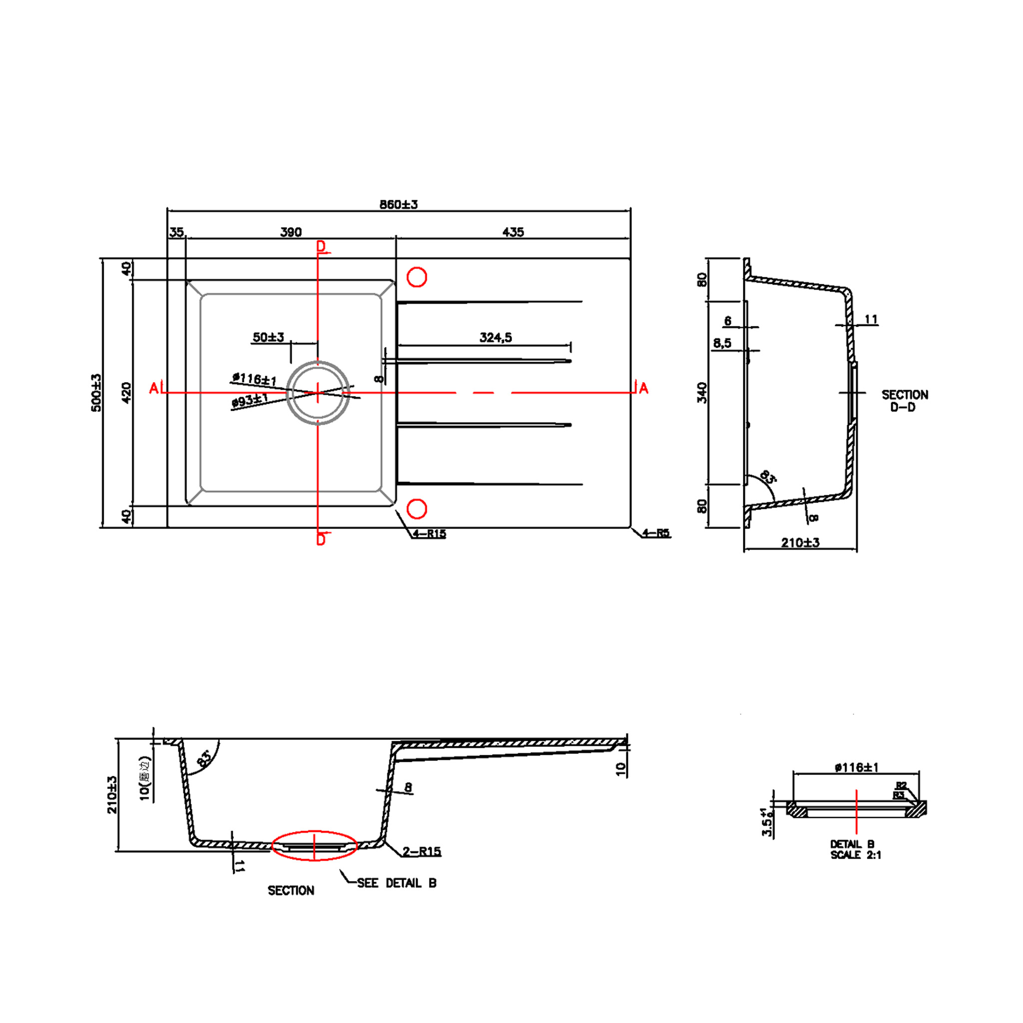 SKU: PGR8650SD-MB Single Bowl with Drainer Composite Granite 860 x 500 x 210mm Above Counter Sink