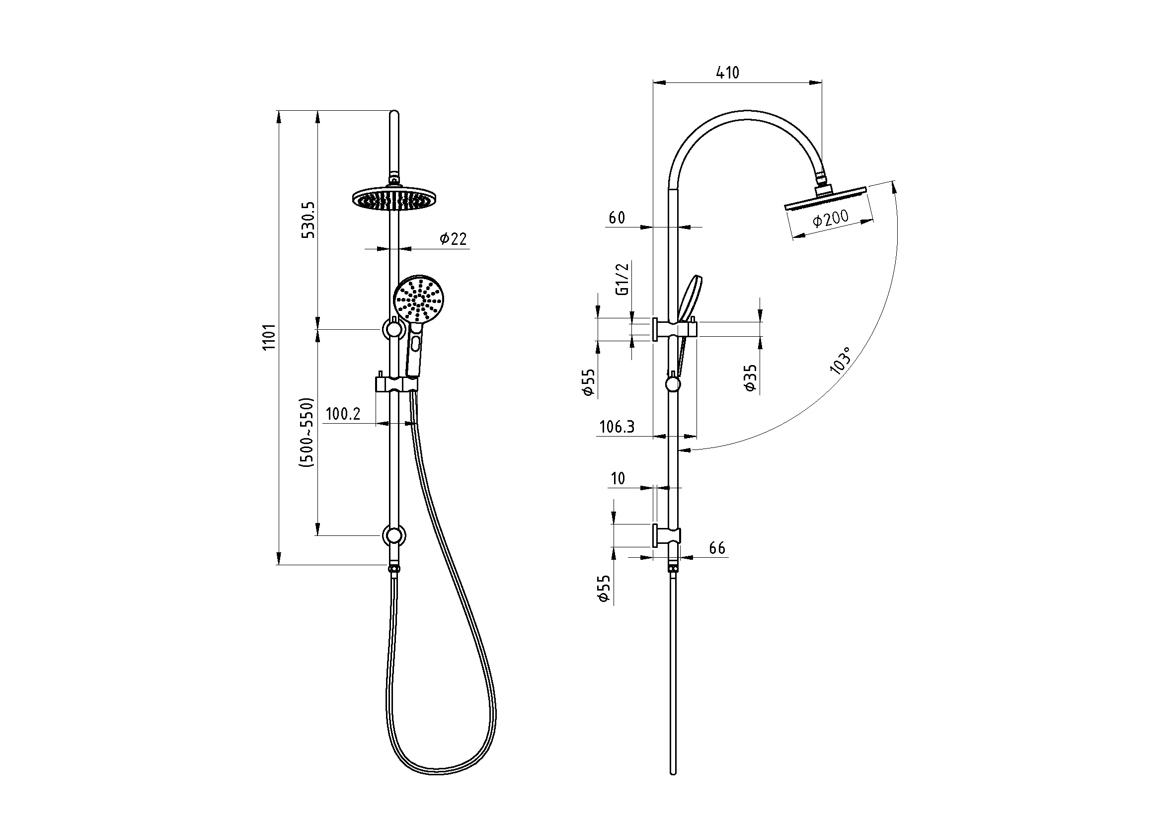 SKU:PHC4502RN-GN Round Gooseneck Multifunction Shower Set 200mm Showerhead Top & Bottom Inlet Brass slider Brass Diverter 1.5m Stainless steel hose 3 Function Hand Shower