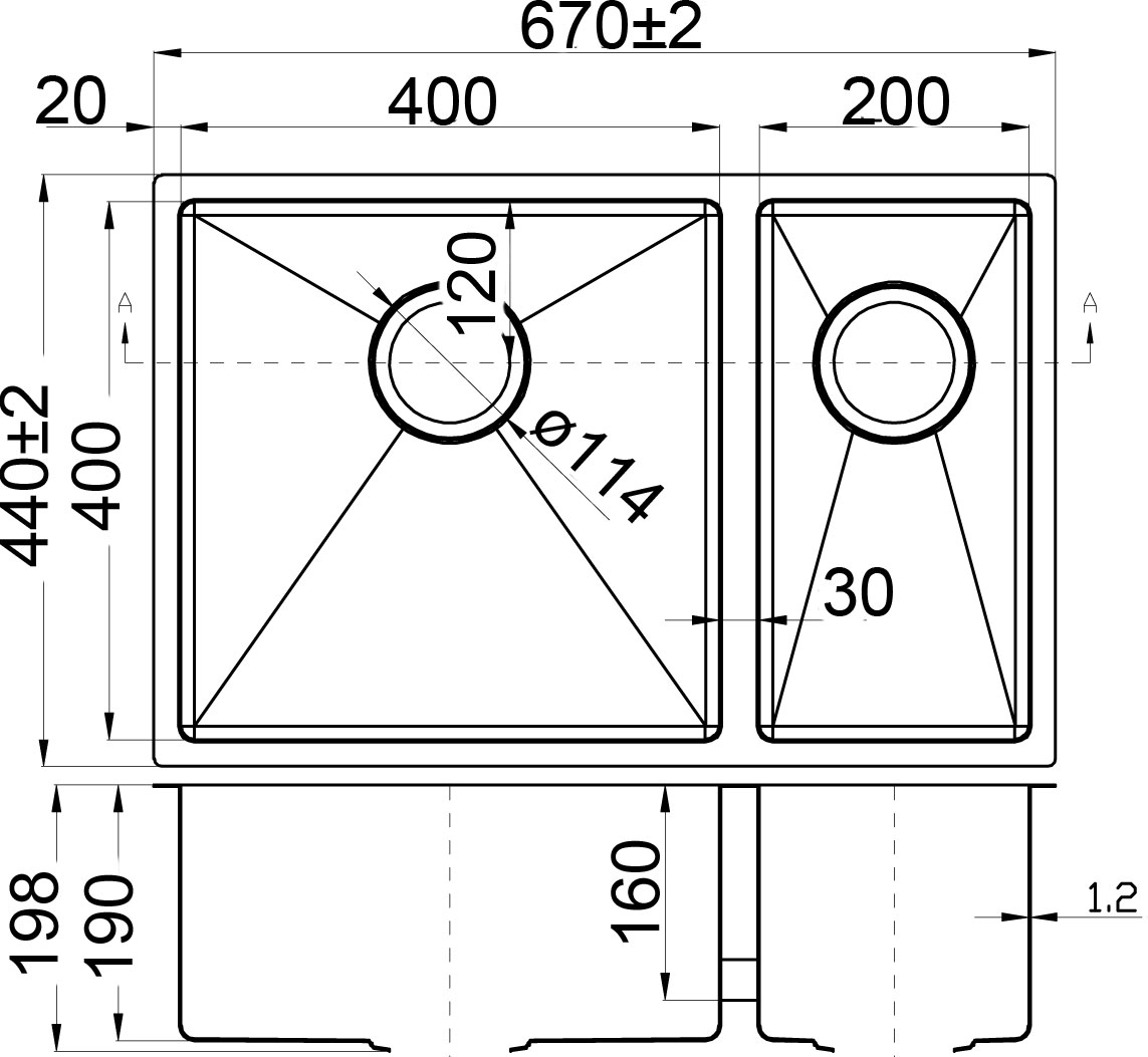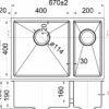 Bowl: 400 (200) x 400 x 190mm; Overall: 670 x 440 x 190mm; Thickness: 1.2mm; Square UnderMount Sink; AIS 304 18/8 grade stainless steel; Mounting clips & basket waste inl.