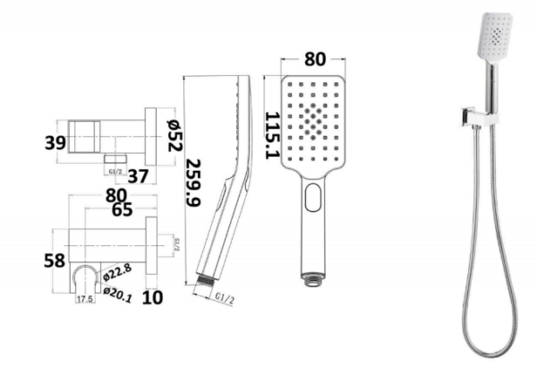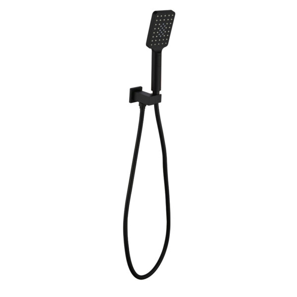SKU: PSH037-1B Square hand shower on wall outlet bracket Square water outlet with holder 1.5m Double Hooked Stainless steel hose 3 Function Hand Shower Matte Black