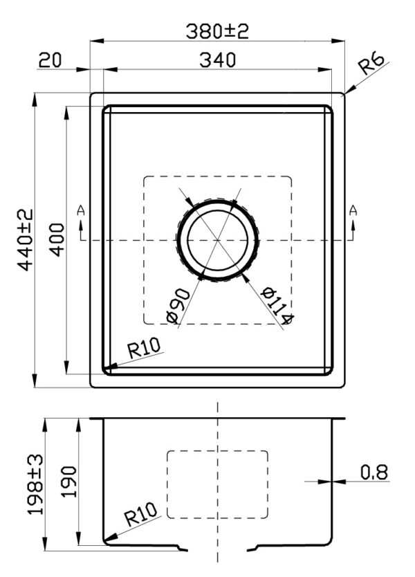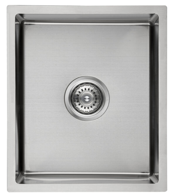 Bowl: 400 x 340 x 190mm; Overall: 440 x 380 x 200mm; Thickness: 0.8mm; Square UnderMount Sink; AIS 304 18/8 grade stainless steel; Mounting clips & basket waste inl.