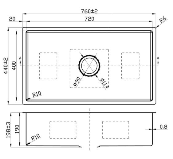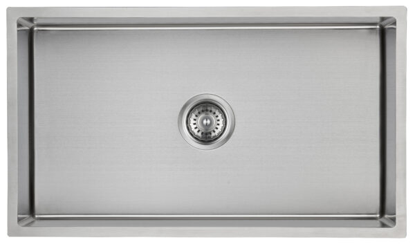 Bowl: 720 x 400 x 190mm; Overall: 760 x 440 x 200mm; Thickness: 0.8mm; Square UnderMount Single Bowl Sink; AIS 304 18/8 grade stainless steel; Mounting clips & basket waste inl.