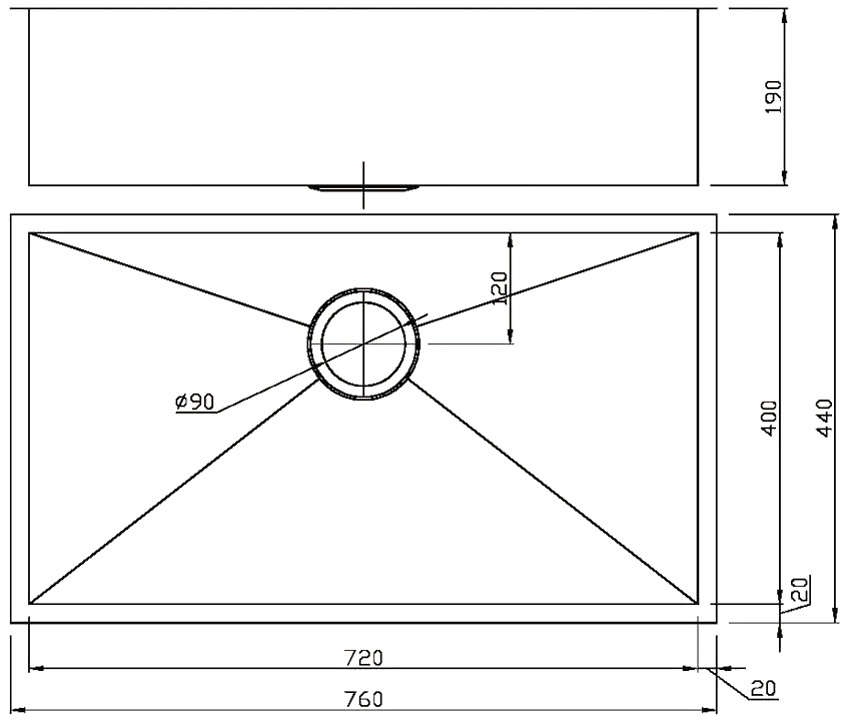 Bowl: 720 x 400 x 190mm; Overall: 760 x 440 x 190mm; Thickness: 1.2mm; Square UnderMount Sink; AIS 304 18/8 grade stainless steel; Mounting clips & basket waste inl.