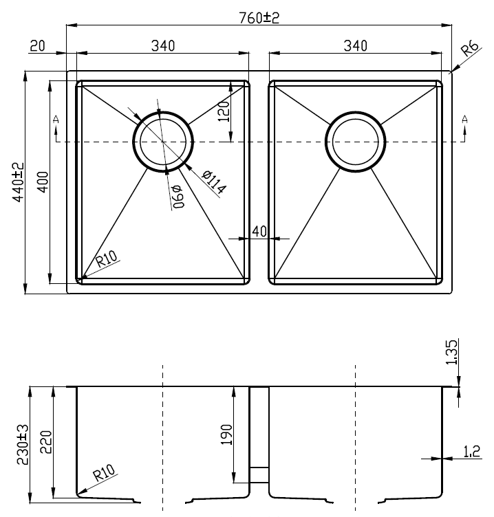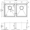 SKU:PS340D Bowls: 340 x 400 x 220; Overall: 760 x 440 x 230mm; Thickness: 1.2mm; Square UnderMount Sink; AIS 304 18/8 grade stainless steel; Mounting clips & basket waste inl.