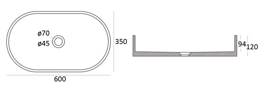 SKU:HTI-22-504 No Tap Hole; Countertop Basin 600 x 350 x 120mm   Dark Grey Concrete   Matching plug cover available Plug & Waste sold separately